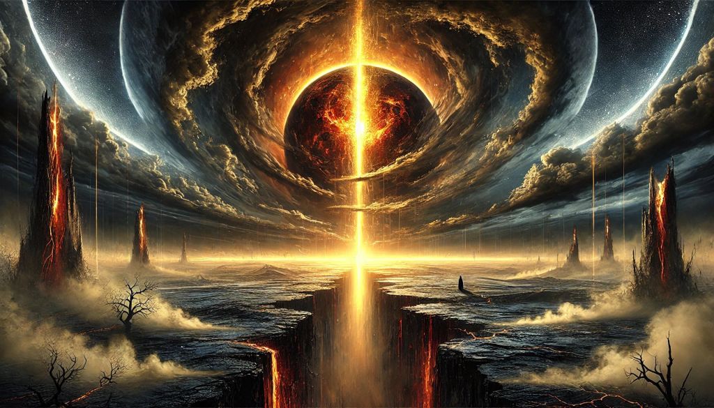 W tej szczelinie świata rodzi się chaos. To niezmienne prawo – gdy jedna siła słabnie, druga nie triumfuje, lecz walczy o dominację. Niebo rozszarpują krwawe błyskawice, a ziemia drży pod naporem cieni, które nie należą do żadnego ciała. Horyzont staje się otwartą raną, miejscem, gdzie dzień nigdy się nie kończy, a noc nigdy nie nadchodzi – zawieszeniem pomiędzy tym, co znane, a tym, co zbyt obce, by je pojąć.