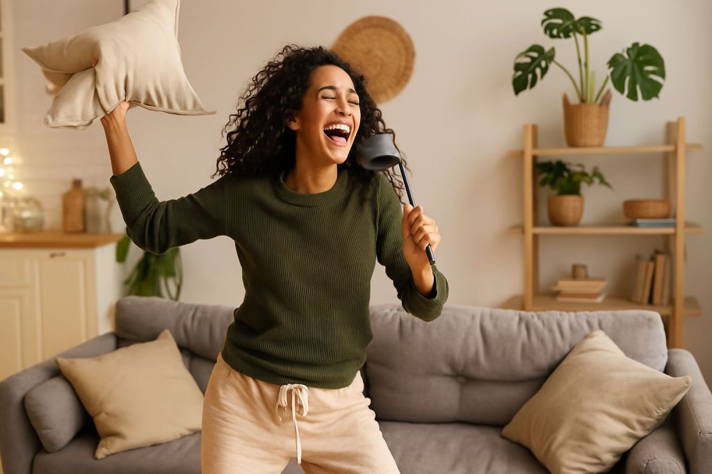 Dla mnie to taniec. Ale nie taki ułożony z tutoriali na YouTube. Mówię o tańcu w kuchni, w piżamie, z łyżką do zupy jako mikrofonem. Mówię o wygibasach, które nie mają nic wspólnego z choreografią, ale za to mają wszystko wspólnego z radością. Albo o spontanicznych bitwach na poduszki, które zaczynają się od niewinnego „Ej, uważaj!” i kończą na zadyszce i śmiechu do łez.